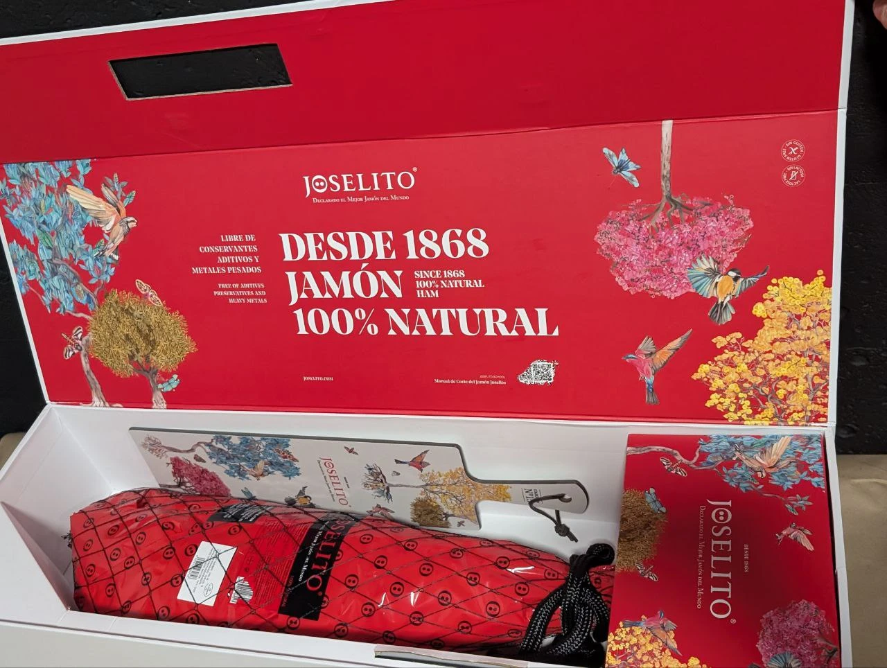 В наборе: хамон Joselito (задняя нога), деревянная доска для подачи, фирменный буклет